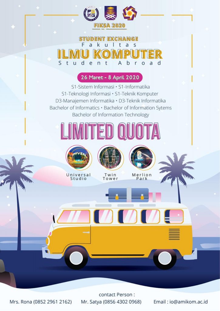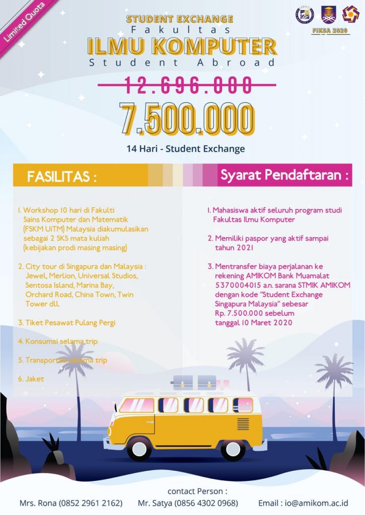 In collaboration with Universiti Teknologi MARA Malaysia (UiTM), AMIKOM is launching an exchange program for 14 days. The fees will cover the tickets, accommodation, food and transportation. And also we arranged for culture trip in Malaysia and Singapore.