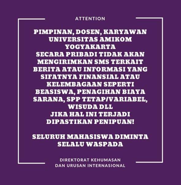Kepada seluruh civitas akamedika Universitas AMIKOM Yogyakarta, diharapkan untuk berhati – hati terhadap informasi hoax yang berkembang saat ini yang mengatasnamakan Pimpinan, Dosen, dan Karyawan Universitas AMIKOM Yogyakarta. Semua info terkait AMIKOM sudah di share di website amikom.ac.id dan seluruh medsos amikom. Nomor hotline yang bisa dihubungi: