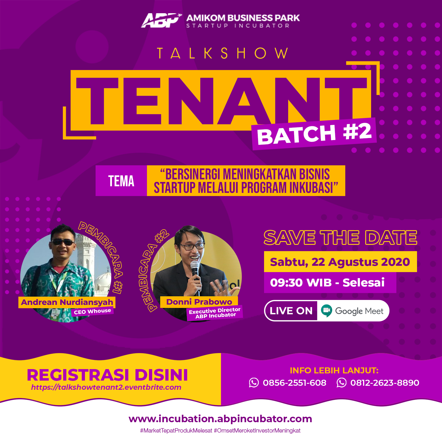 Talkshow Tenant batch#2 kali ini akan membahas tentang sinergi meningkatkan bisnis melalui program inkubasi.