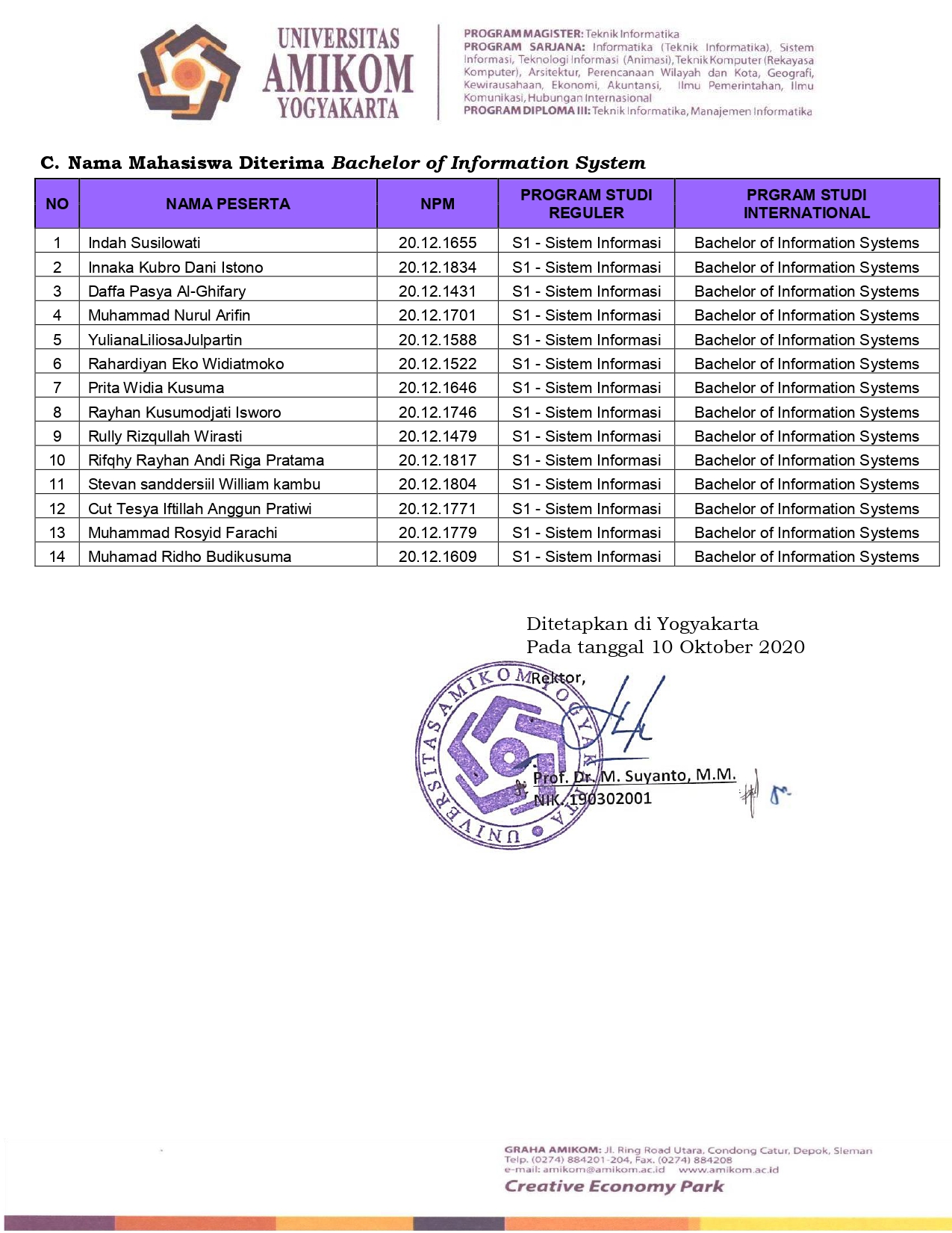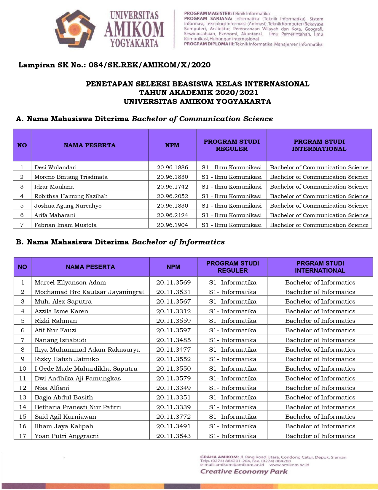 Surat Keputusan Penetapan Seleksi Beasiswa Kelas International TA. 2020/2021 Universitas AMIKOM Yogyakarta