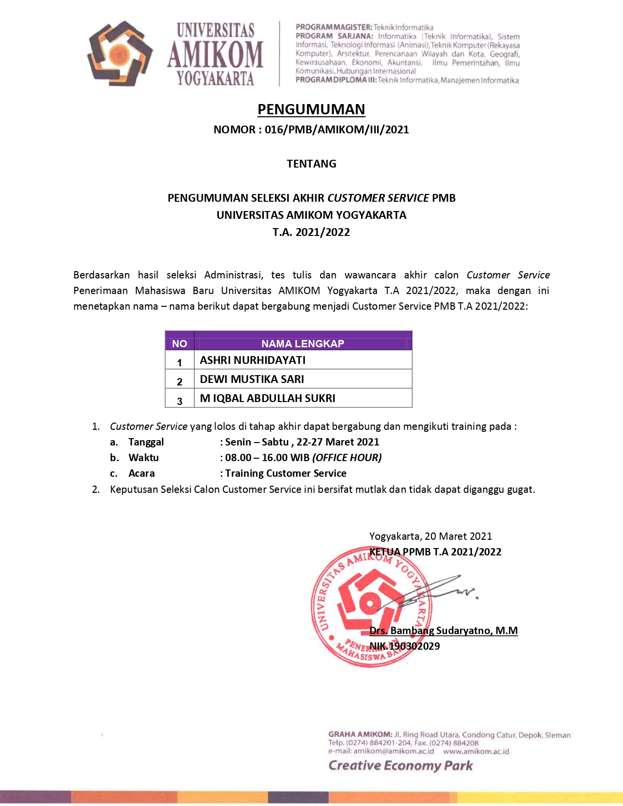 PENGUMUMAN SELEKSI AKHIR CS PMB 2021