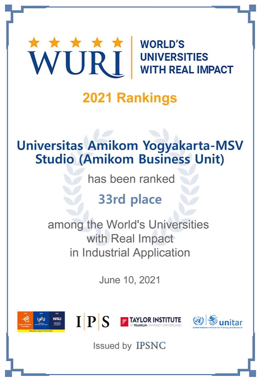 Untuk kesekian kalinya, Universitas Amikom Yogyakarta kembali mendapat pengakuan dari dunia internasional. Berdasarkan rilis resmi dari World’s Universities with Real Impact (WURI), Universitas Amikom Yogyakarta berhasil mendapatkan peringkat 33 dunia, untuk kategori Industrial Aplication. Pengumuman Ranking WURI 2021 ini ditayangkan secara daring melalui video konference pada tanggal 10 Juni 2021.