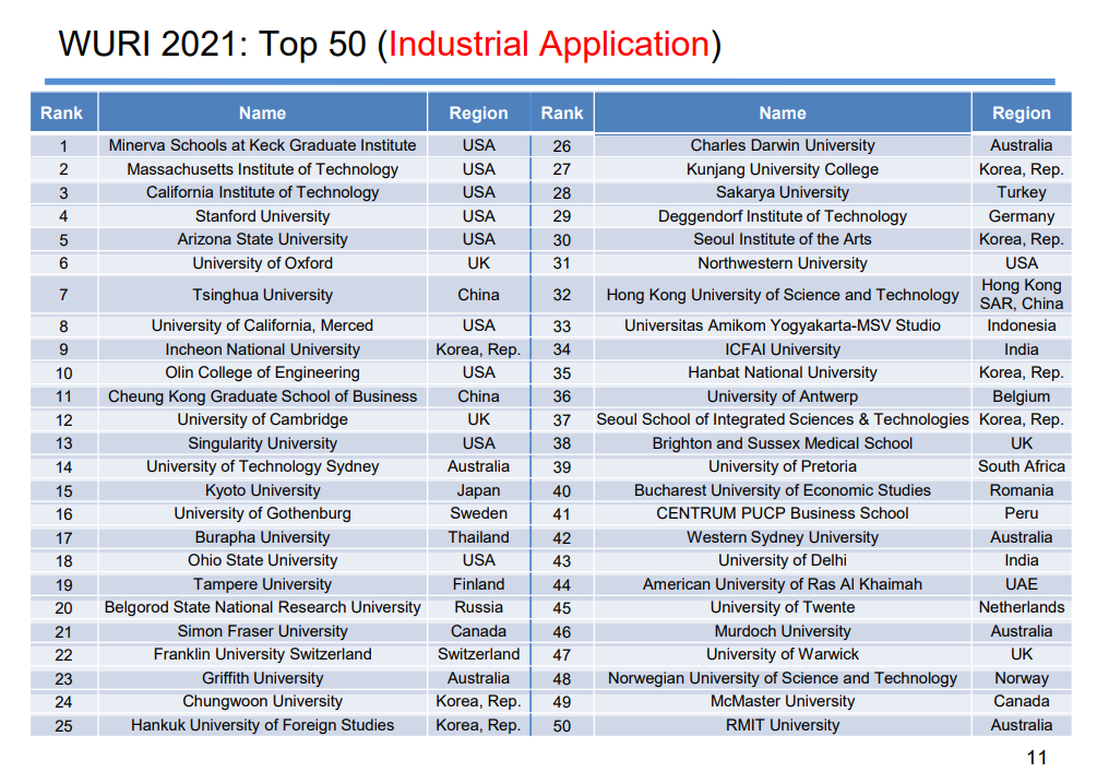 Berikut adalah 50 Perguruan Tinggi Dunia terbaik versi World’s Universities with Real Impact (WURI) untuk Kategori Industrial Aplication: