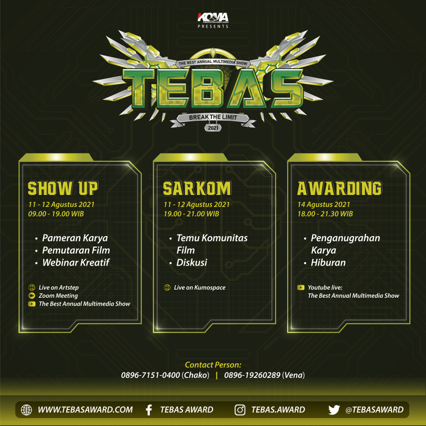 Kompetisi Multimedia tingkat Nasional “The Best Annual Multimedia Show” (TEBAS) merupakan wadah apresiasi karya para kreator multimedia se-Indonesia yang dipersembahkan oleh Komunitas Multimedia Amikom (KOMA) Yogyakarta. Acara ini sudah berlangsung cukup lama dan tahun ini adalah tahun ke-11 TEBAS diselenggarakan kembali. Namun, hadirnya Pandemi Covid-19 yang belum berakhir kali ini TEBAS 2021 diselenggarakan kembali secara daring.