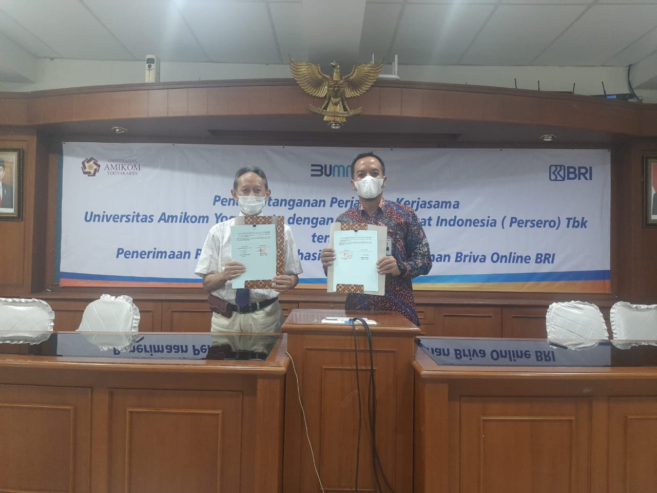 Universitas Amikom Yogyakarta dan Bank Rakyat Indonesia (BRI) Cabang Sleman menjalin kerjasama terkait dengan Penempatan Dana dan Layanan Pembayaran Mahasiswa menggunakan BRIVA Online BRI pada hari Kamis, (21/10) di Ruang Citra 1 Universitas Amikom Yogyakarta. Penandatanganan MoU ini dilakukan oleh Rektor Universitas Amikom Yogyakarta, Prof. Dr. M. Suyanto., M.M., dan Pemimpin Cabang (Pimca) BRI Sleman, Yuwanda Rahman.