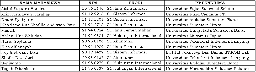 Program ini sendiri merupakan program pertukaran mahasiswa selama satu semester dari satu klaster daerah ke klaster daerah lainnya yang memberikan pengalaman kebhinekaan dan sistem alih kredit sebanyak 20 SKS. Dengan Mengikuti Program ini, mahasiswa diharapkan dapat mengeksplor & mempelajari keberagaman budaya nusantara, berteman dengan mahasiswa dari berbagai daerah dan berkesempatan belajar di kampus lain di Indonesia.