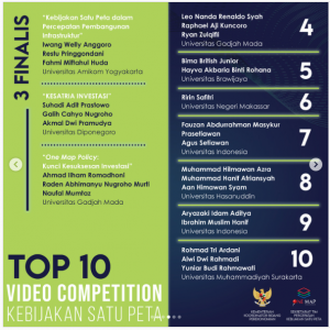 Dalam kompetisi tersebut, Tim Universitas Amikom Yogyakarta, yang terdiri dari Iwang Welly Anggora, Restu Pringgondani, dan Fahmi Miftahul Huda., mengangkat subtema Kebijakan Satu Peta dalam Percepatan Pembangunan Infrastruktur, dimana dalam videonya berisi paparan informatif tentang kebijakan satu peta yang bisa jadi perencanaan pembangunan nasional yang lebih terarah, merata dan sesuai dengan potensi wilayahnya masing-masing.