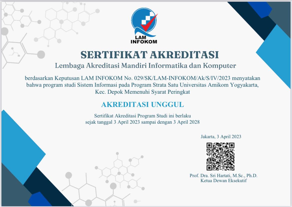 Program Studi sistem informasi Fakultas Ilmu Komputer Universitas AMIKOM Yogyakarta berhasil mendapatkan Akreditasi Unggul oleh Lembaga Akreditasi Mandiri Program Studi Informatika dan Komputer (LAM Infokom). Akreditasi Unggul adalah peringkat akreditasi tertinggi yang diperoleh perguruan tinggi atau program studi yang memenuhi kriteria akreditasi dari Badan Akreditasi Nasional Perguruan Tinggi (BAN-PT).