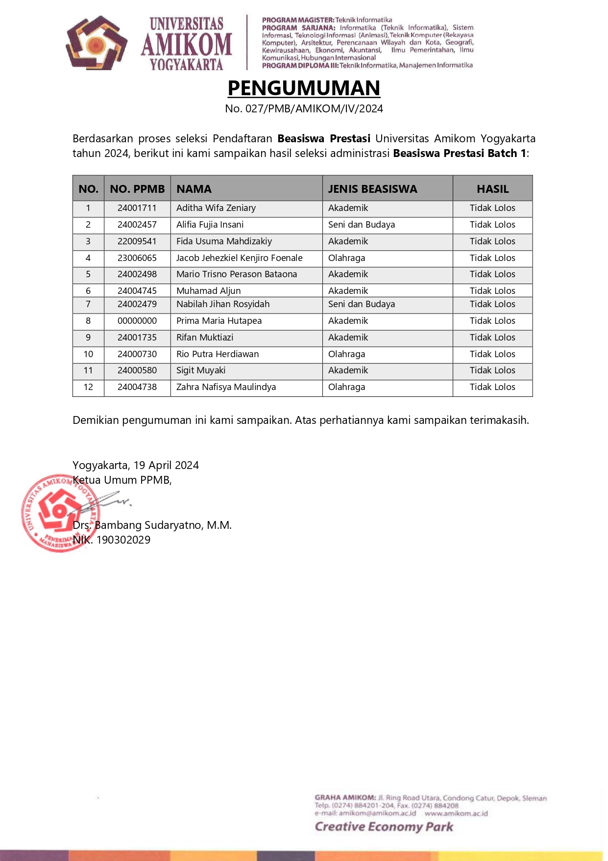 Pengumuman Hasil Seleksi Administrasi Beasiswa Prestasi Batch 1 TA. 2024/2025