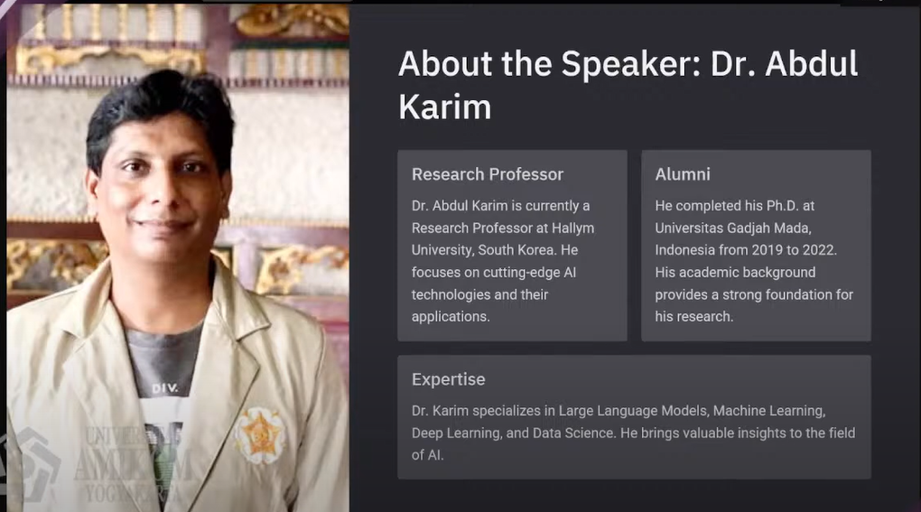 Dr. Abdul Karim Asif, seorang pakar kecerdasan buatan dari Hallym University, Korea Selatan, memberikan pemaparan mendalam tentang Artificial Intelligence (AI) dan Generative AI dalam workshop daring bertajuk “AI: LLM and Generative AI” yang diselenggarakan secara daring oleh Program Magister Teknik Informatika Universitas Amikom Yogyakarta, Sabtu (21/12).