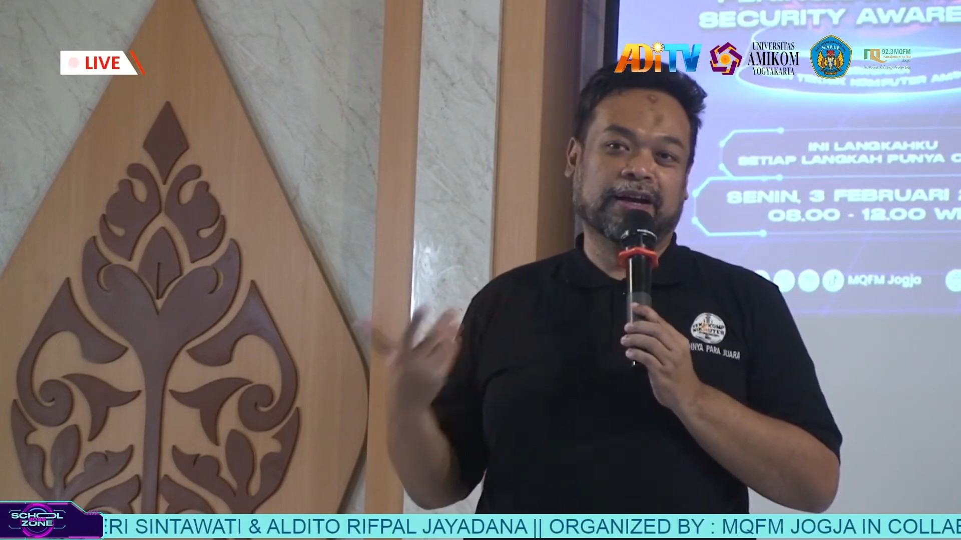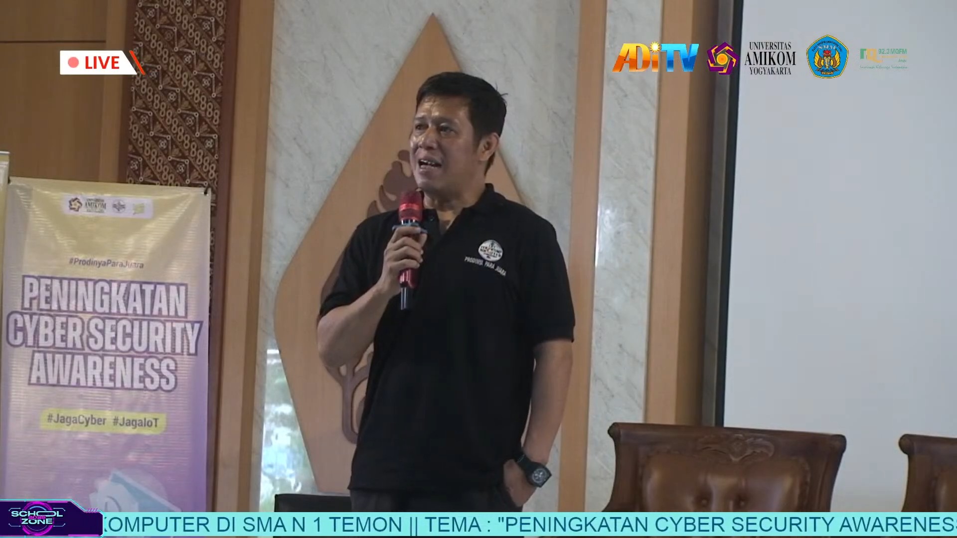 Acara School Zone 2025 ini ditutup dengan penyampaian pesan dari Dr. Dony Ariyus, Ketua Program Studi Teknik Komputer Universitas Amikom Yogyakarta, yang menegaskan bahwa banyak kasus serangan siber terjadi bukan karena sistem yang lemah, tetapi karena kelalaian pengguna.