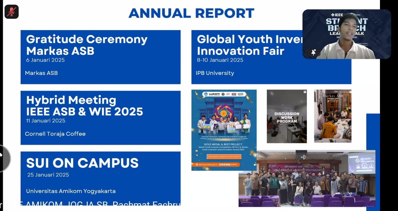Ketua IEEE Universitas Amikom Yogyakarta Student Branch, Rachmat Fachrurrozi, yang menjadi salah satu pembicara dalam acara IEEE Student Branch Leaders Talk, yang diselenggarakan oleh IEEE Indonesia Section. Dalam kesempatan ini, Rachmat mempresentasikan Annual Report & Annual Plan IEEE Universitas Amikom Yogyakarta Student Branch, yang berisi laporan kegiatan tahunan serta strategi pengembangan organisasi untuk tahun mendatang.