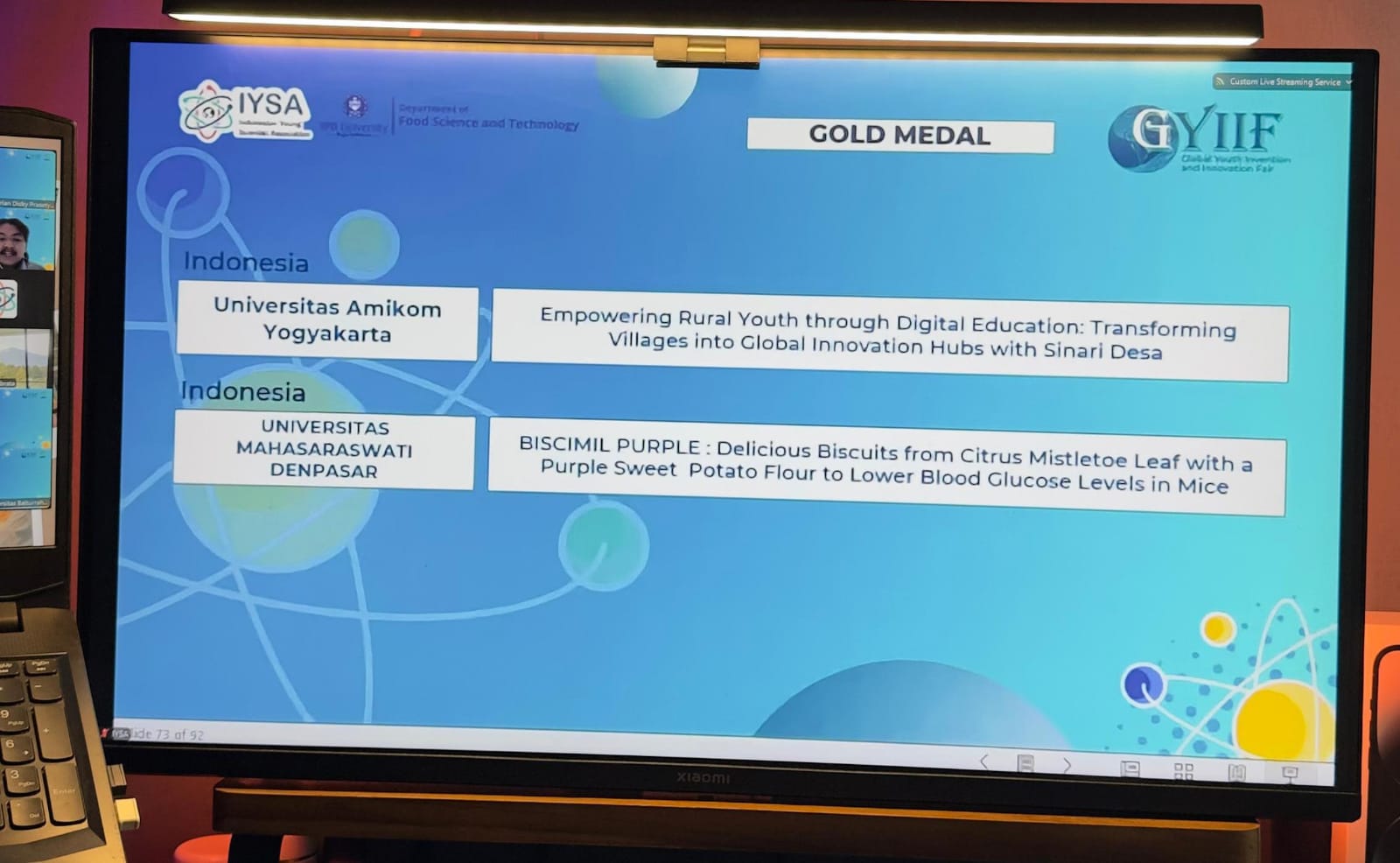 Yogyakarta, 14 Januari 2025 – Universitas Amikom Yogyakarta mencatatkan prestasi membanggakan dengan meraih Gold Medal dalam kategori Innovation Science di ajang Global Youth Invention and Innovation Fair (GYIIF) 2025. Kompetisi internasional ini diselenggarakan oleh Indonesian Young Scientist Association (IYSA) bekerja sama dengan Departemen Ilmu dan Teknologi Pangan, Institut Pertanian Bogor (IPB). Untuk Online Event, Penghargaan diberikan dalam sesi Awarding Ceremony yang dilaksanakan secara daring melalui Zoom pada 14 Januari 2025.