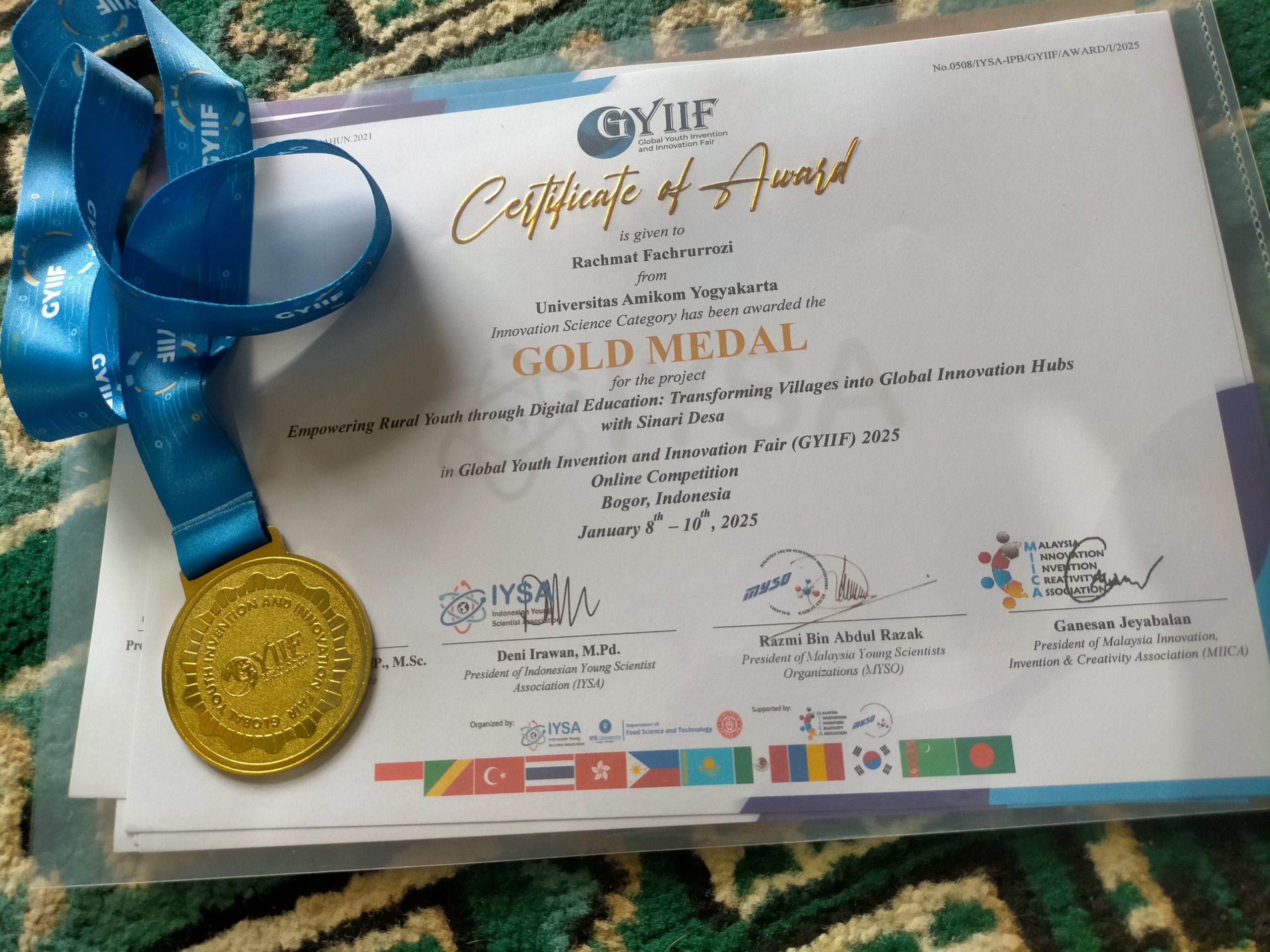 Tim Universitas Amikom Yogyakarta yang terdiri dari Rachmat Fachrurrozi, Grishandy Rifki Ardianto, Lingga Eka Praditya Tama, M. Gusbayu Aji Setiawan, dan Afrian Dicky Prasetya berhasil meraih Gold Medal dalam kompetisi tersebut dengan judul Inovasi “Empowering Rural Youth through Digital Education: Transforming Villages into Global Innovation Hubs with Sinari Desa.”