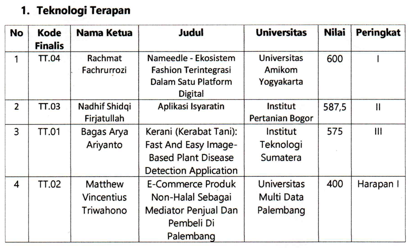 Setelah melalui penjurian yang ketat selama beberapa minggu, Untuk Kategori Teknologi Terapan, Nameedle yang dibuat oleh Mahasiswa Amikom berhasil menjadi Juara 1 Setelah mengalahkan Aplikasi Isyaratin (Institut Pertanian Bogor) Di Peringkat Kedua, dan Kerani ~ Kerabat Tani: Fast And Easy Image-Based Plant Disease Detection Application (Institut Teknologi Sumatera) Di Peringkat ketiga.