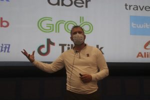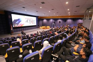 Presiden Silicon Valley Innovation Center, Andrey Kunov PhD, sedang memberikan ceramah tentang Entrepreneur Technology di Ruang Cinema, Universitas Amikom Yogyakarta.