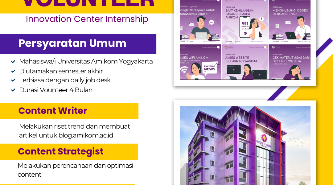 Selamat datang di kesempatan emas untuk bergabung dengan Program Oprec Volunteer di Innovation Center Amikom Yogyakarta! Kami membuka lowongan untuk para volunteer yang antusias dan berbakat untuk mendukung berbagai aktivitas inovatif di kampus. Program ini dirancang untuk memberikan pengalaman berharga, mengasah keterampilan, dan membuka peluang pengembangan diri bagi mahasiswa. Yuk, simak informasi lengkapnya di https://blog.amikom.ac.id/volunteer