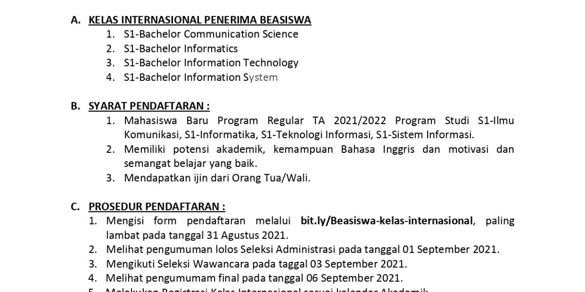 Read MoreDiberi kesempatan kepada Mahasiswa Baru Universitas AMIKOM Yogyakarta Tahun Akademik 2021/2022 untuk mengikuti seleksi Beasiswa Kelas Internasional Universitas AMIKOM Yogyakarta Tahun 2021. A. KELAS INTERNASIONAL PENERIMA BEASISWA S1-Bachelor of Communication Science S1-Bachelor of Informatics S1-Bachelor of Information Technology S1-Bachelor of Information System B. SYARAT PENDAFTARAN : Mahasiswa Baru Program Regular TA 2021/2022 Program Studi […]