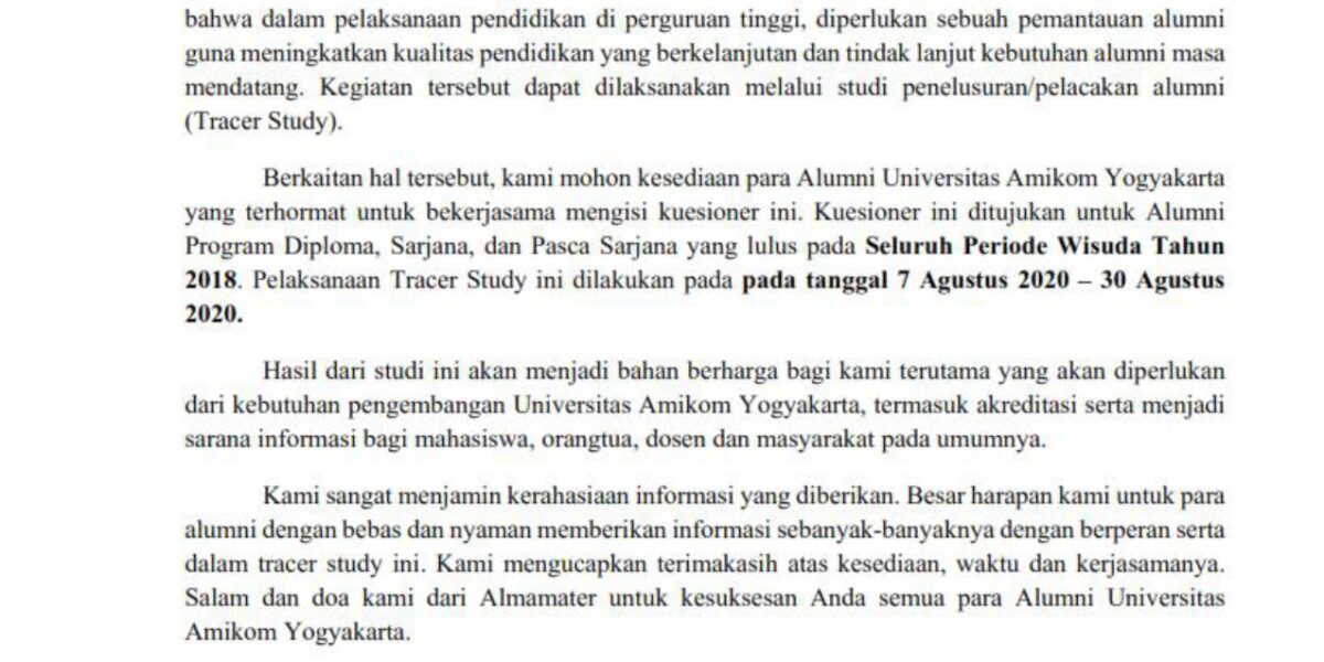 Tracer study ini ditujukan untuk Alumni Program Diploma, Sarjana dan Pasca Sarjana yang lulus pada seluruh periode wisuda Tahun 2018. Info lengkap bisa klik dibawah ini.