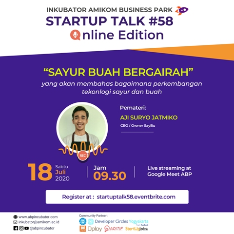 Read MoreHai sobat ABP Startup Talk kali ini akan membahas tentang perkembangan teknologi sayur dan buah saat ini. Penasaran kan bagaimana perkembangan teknologinya? Yuk cari tau jawabannya di Startup talk #58 bersama Mas Aji Suryo Jatmiko selaku CEO SayBu. * Save the date! * With Google Meet. ️ : Sabtu,18 Juli 2020 : 09.30 – selesai […]