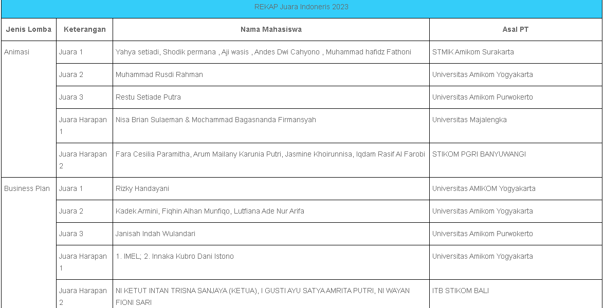 Read MoreMahasiswa Universitas AMIKOM Yogyakarta berhasil memboyong 6 gelar dalam ajang Indoneris IT Competition yang diselenggarakan oleh Universitas Amikom Purwokerto, bekerjasama dengan NERIS, CORIS dan INDOCEISS Dalam ajang tersebut, Mahasiswa Universitas Amikom Yogyakarta berhasil meraih 2 Juara 1, 2 Juara 2, dan 2 Juara Harapan 1, dengan rincian sebagai berikut: Juara 1 Kategori Business Plan : […]
