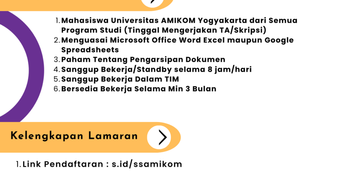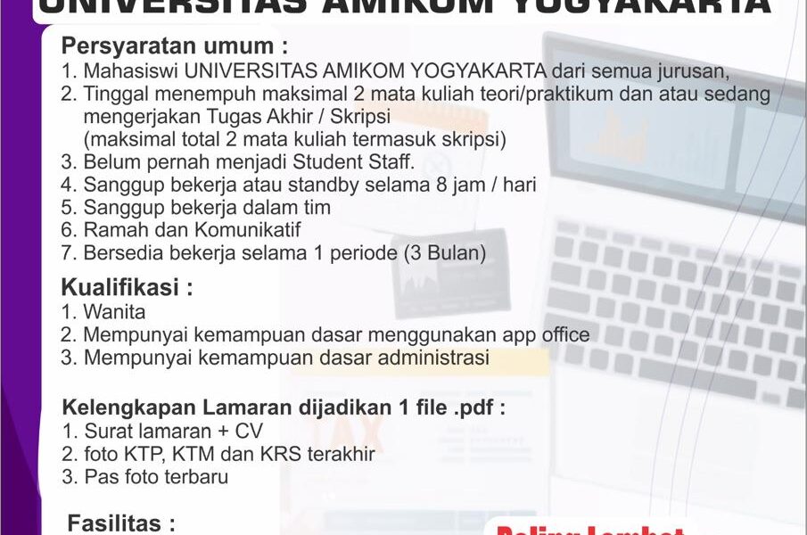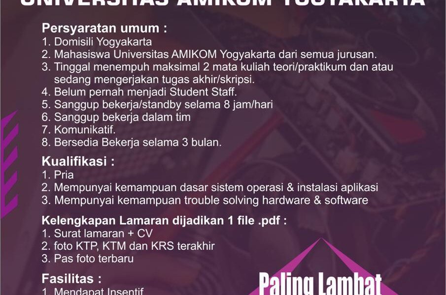 Read MorePersyaratan Umum * Mahasiswa Universitas Amikom Yogyakarta Pria/Wanita dari semua jurusan (telah menempuh semua teori dan tinggal mengerjakan TA / Skripsi ) * Sehat Jasmani dan Rohani * Sanggup bekerja atau standby selama 8 jam / hari * Sanggup bekerja dalam tim * Berpenampilan Rapi, Kreatif & Komunikatif * Bersedia bekerja selama min 3 Bulan. […]