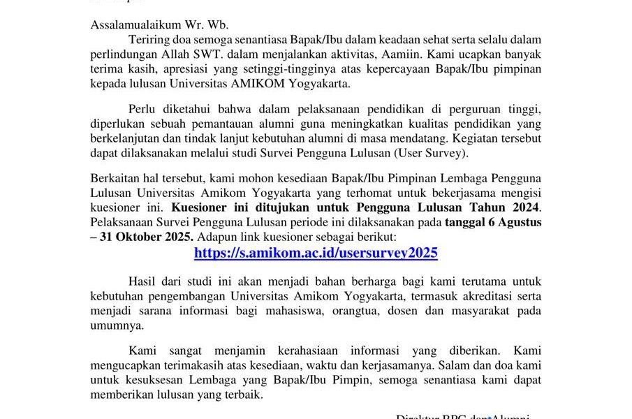 Read MorePermohonan Pengisian Survei Pengguna Lulusan Pelaksanaan 2025