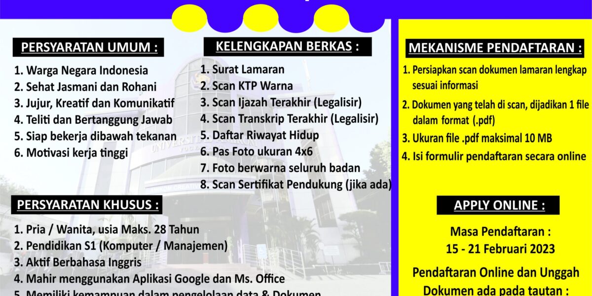 Read MoreDirektorat Lembaga Penelitian dan Pengabdian Masyarakat (LPPM) Universitas AMIKOM Yogyakarta membuka kesempatan bagi mahasiswa / mahasiswi untuk menjadi student staff dengan kualifikasi sebagai berikut: Persyaratan Umum: Mahasiswa UNIVERSITAS AMIKOM YOGYAKARTA dari semua Program Studi (telah menempuh semua teori dan tinggal mengerjakan TA / Skripsi) Sehat Jasmani dan Rohani Belum pernah ikut Student staff Sanggup bekerja atau standby selama 8 jam / hari […]
