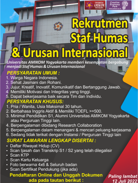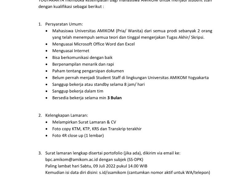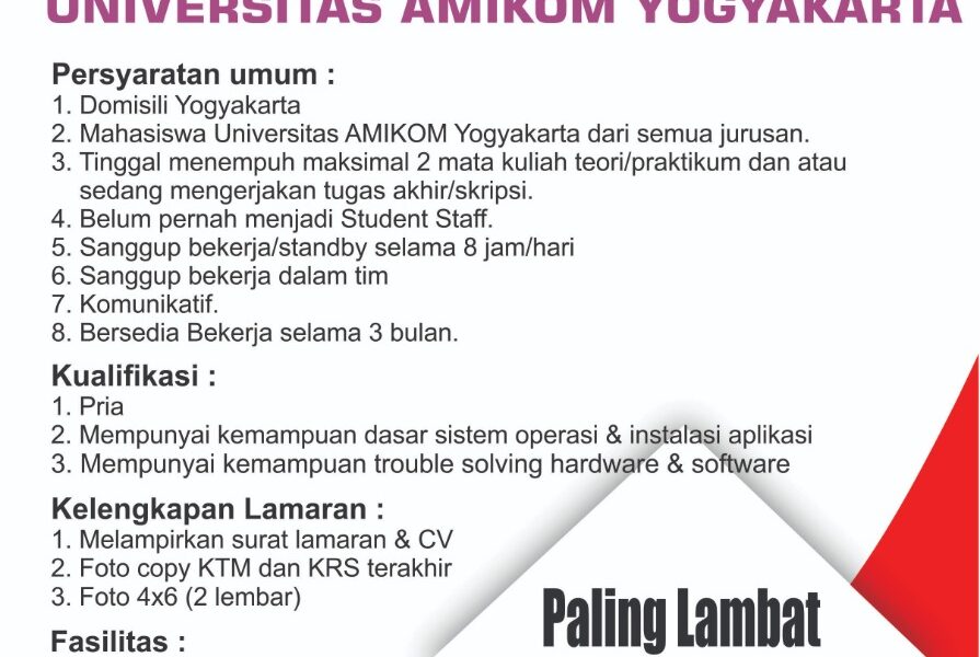 Read MorePersyaratan Umum: Mahasiswa UNIVERSITAS AMIKOM YOGYAKARTA dari semua Program Studi (telah menempuh semua teori dan tinggal mengerjakan TA / Skripsi). Sehat Jasmani dan Rohani. Belum pernah menjadi Student staff. Sanggup bekerja atau standby selama 8 jam / hari. Sanggup bekerja dalam tim. Komunikatif. Bersedia bekerja selama minimal 3 Bulan. Kelengkapan Lamaran: Melampirkan Surat Lamaran & lamp; […]