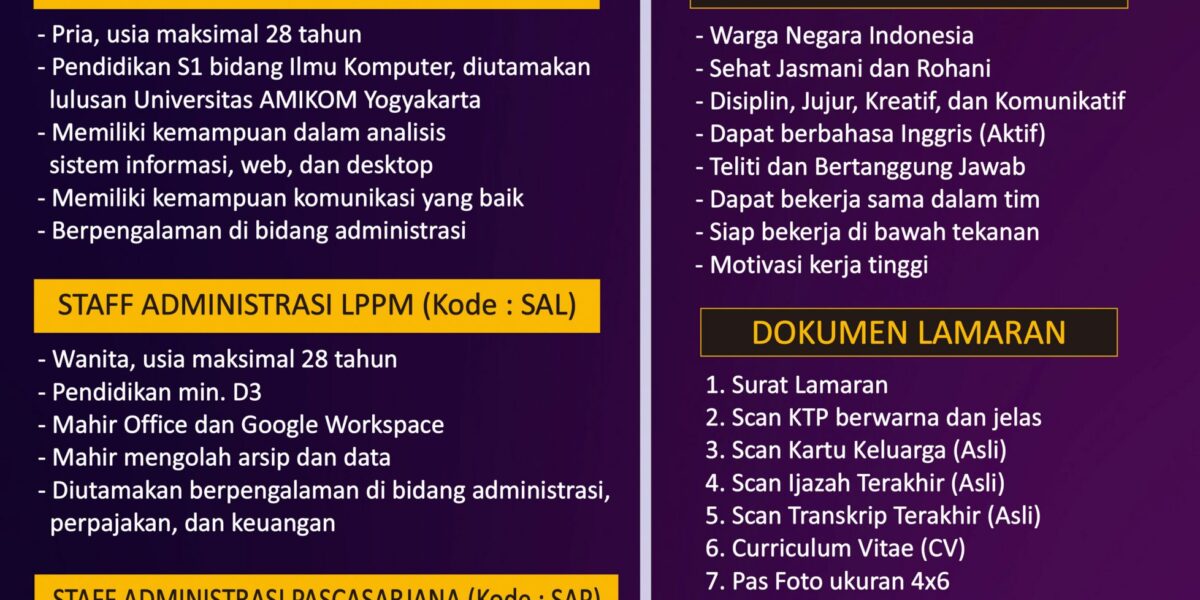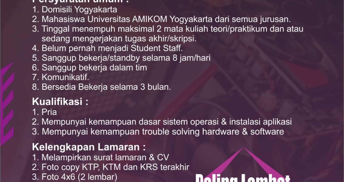 Read MorePersyaratan Umum: • Mahasiswa Universitas Amikom (Pria) dari semua jurusan( telah menempuh semua teori dan tinggal mengerjakan TA / Skripsi ) • Sehat Jasmani dan Rohani • Belum pernah menjadi Student Staff di bagian lain di Universitas AMIKOM Yogyakarta • Sanggup bekerja atau standby selama 8 jam / hari • Sanggup bekerja dalam tim • […]