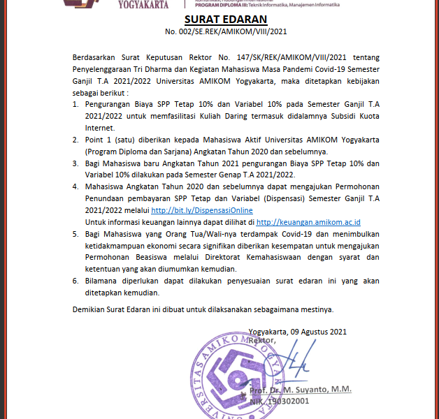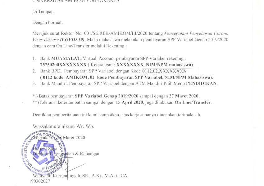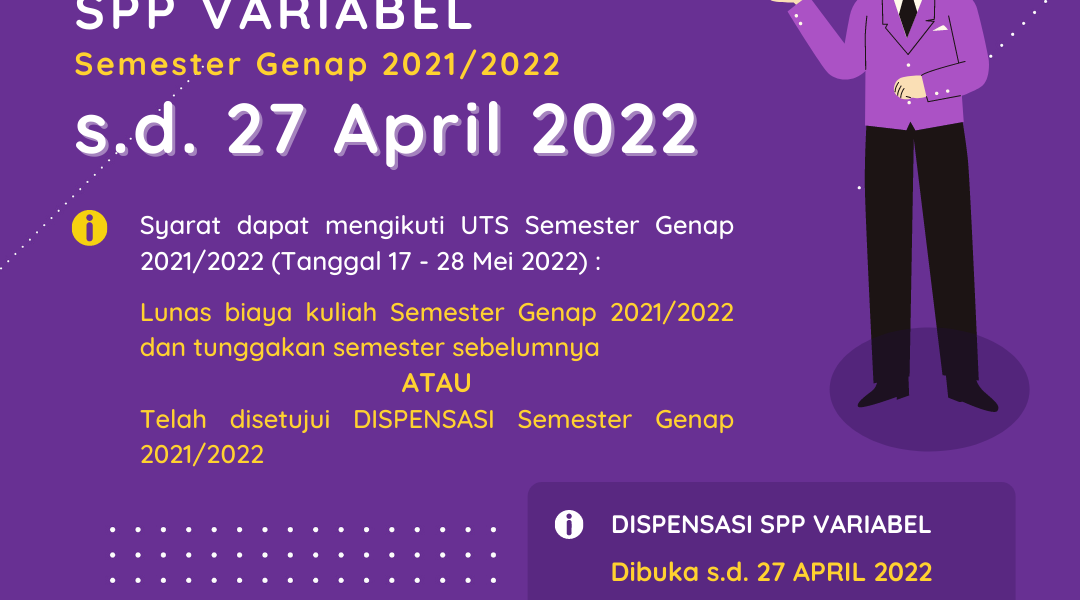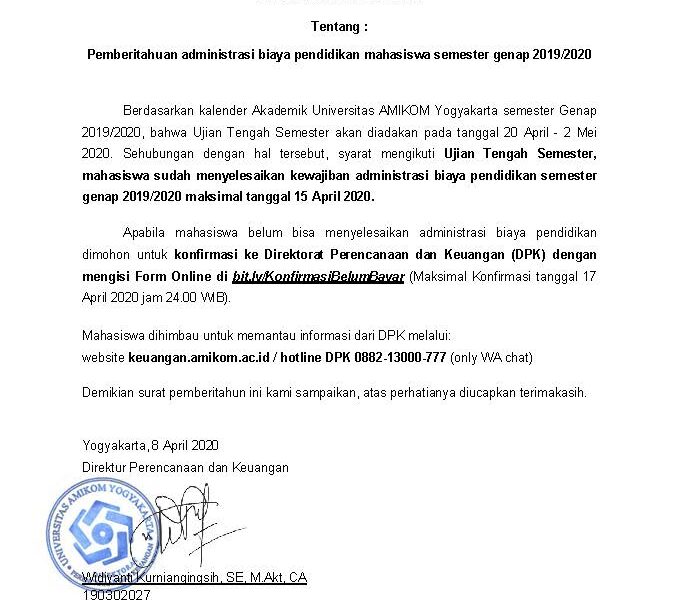 Read MoreTerkait dengan administrasi biaya pendidikan semester Genap 2019/2020 sebagai syarat mengikuti ujian UTS tanggal 20-30 April 2020. Bagi mahasiswa yang belum dapat memenuhi syarat tersebut dikarenakan situasi dan kondisi WARNING COVID-19, kami informasikan sebagai berikut :
