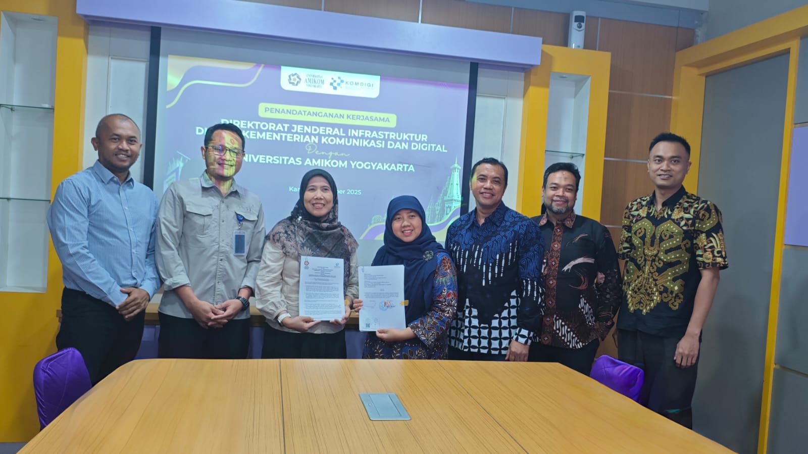 Yogyakarta, 16 Oktober 2025 – Direktorat Jenderal Infrastruktur Digital Kementerian Komunikasi dan Digital (Komdigi) menjalin kerja sama resmi dengan Universitas AMIKOM Yogyakarta melalui penandatanganan Memorandum of Understanding (MoU) terkait Program Tugas Belajar untuk pegawai melalui Pembelajaran Jarak Jauh (PJJ) Magister Informatika. Acara penandatanganan berlangsung di Ruang Meeting 1 Universitas AMIKOM Yogyakarta pada Kamis, 16 Oktober 2025, pukul 11.00 WIB.