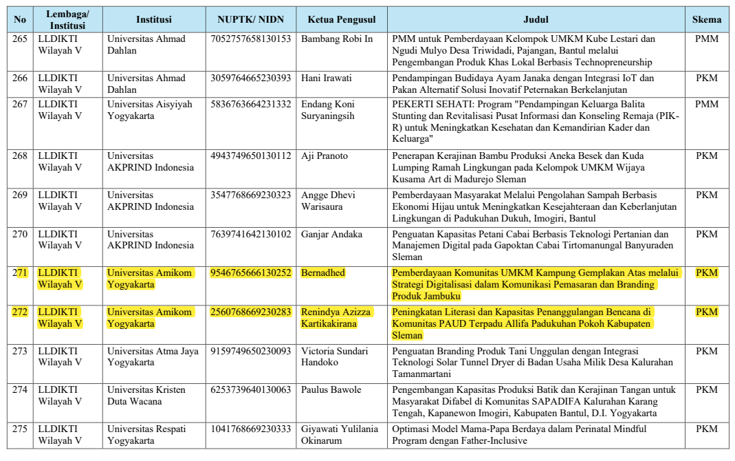 Dua dosen Universitas AMIKOM Yogyakarta berhasil meraih pendanaan Program Pengabdian kepada Masyarakat Batch II Tahun Anggaran 2025 dari Direktorat Penelitian dan Pengabdian kepada Masyarakat (DPPM) Kementerian Pendidikan Tinggi, Sains, dan Teknologi. Kedua dosen tersebut masing-masing mengusung program inovatif untuk memberdayakan masyarakat di wilayah Yogyakarta.