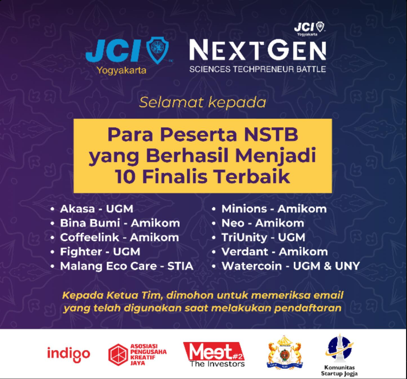 Yogyakarta, 16 Mei 2025 — Lima tim mahasiswa Universitas AMIKOM Yogyakarta berhasil menembus babak final kompetisi nasional NextGen Sciences Techpreneur Battle (NSTB) 2025 yang diselenggarakan oleh JCI Yogyakarta. Grand Final kompetisi ini dilangsungkan di IndigoHub Jogja, Jum’at (16/5), dan diikuti oleh 10 tim finalis dari total 55 peserta se-Indonesia. Pada babak puncak ini, dua tim dari Universitas AMIKOM Yogyakarta berhasil menyabet gelar juara, yaitu Binabumi (Runner Up) dan Coffeelink (Juara 3).