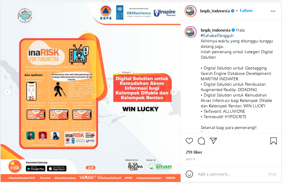 Tim WIN LUCKY Universitas Amikom Yogyakarta berhasil menjadi pemenang InaRISK Hackathon Fest (IHF) 2021, untuk Kategori Digital Solution untuk Kemudahan Akses Informasi bagi Kelompok Difable dan Kelompok Rentan. Perhelatan IHF 2021 merupakan kolaborasi Badan Nasional Penanggulangan Bencana (BNPB) dan United Nations Development Programme (UNDP) bekerja sama dengan Pemerintah Jepang dan U-Inspire Indonesia.