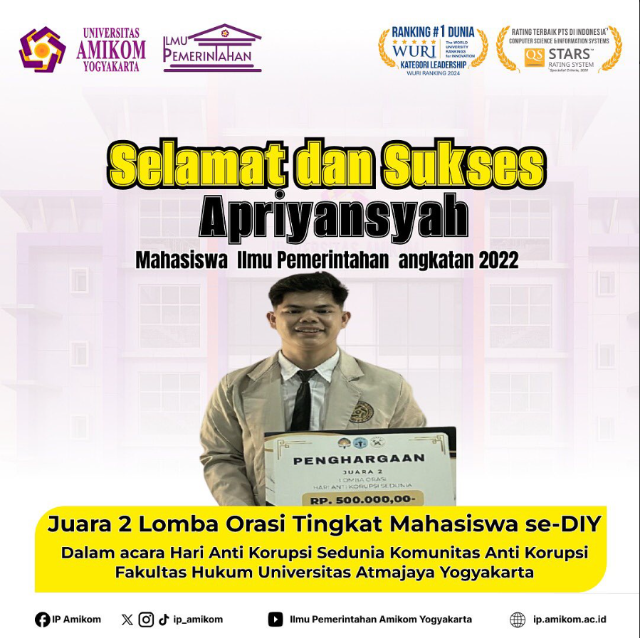 Yogyakarta, 7 Desember 2024 – Apriansyah, mahasiswa Program Studi Ilmu Pemerintahan angkatan 2022 Universitas Amikom Yogyakarta, berhasil meraih Juara 2 dalam Lomba Orasi dan Poster HAKORDIA KOMUTASI #8 se-DIY. Kompetisi yang diadakan oleh Komunitas Mahasiswa Fakultas Hukum Universitas Atma Jaya Yogyakarta ini berlangsung pada 7 Desember 2024, sebagai rangkaian peringatan Hari Anti Korupsi Sedunia (HAKORDIA).