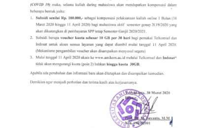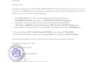 Jadwal dan tata cara pembayaran SPP Variabel Dispensasi Sarana dan Variabel dispensasi diajukan apabila pelunasan tagihan dilakukan melebihi batas toleransi keterlambatan pembayaran 15 April 2020. Jika sebelumnya telah mengajukan dispensasi dan telah jatuh tempo maka wajib melakukan perpanjangan dispensasi. Syarat dispensasi : melakukan pembayaran sebagian* dari jumlah tagihan. melengkapi form di bit.ly/DispensasiOnline *besaran pembayaran tidak […]