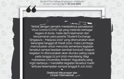 Terkait dengan semakin merebaknya penyebaran Virus Corona (COVID-19) yang melanda berbagai negara di dunia, maka demi keamanan dan kenyamanan para peserta “Student Exchange Singapura – Malaysia 2020” yang direncanakan akan berangkat tanggal 26 Maret 2020, maka Lembaga memutuskan untuk menunda sementara kegiatan tersebut sampai keadaan kembali kondusif. Adapun kegiatan ini direncanakan akan diundur paling cepat […]