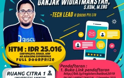 PRODI SISTEM INFORMATIKA UNIVERSITAS AMIKOM YOGYAKARTA Presents : SEMINAR PRODI INFORMATIKA 2019 Dengan tema : CHATBOT, Technology Under the Hood Menghadirkan pembicara yg berkompeten di bidangnya : Purwaji Santoso, S.Kom., M.Eng Tech Lead @Qiscus PTE LTD Kapan sih acaranya ? Yuk dicatat tanggalnya : ? : Sabtu, 14 Desember 2019 ⏰ : 08.00 – selesai […]