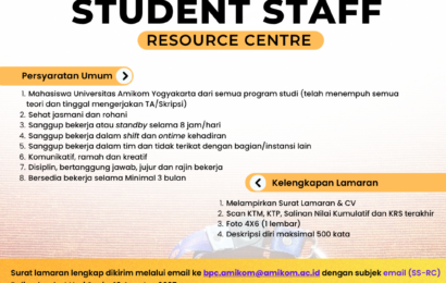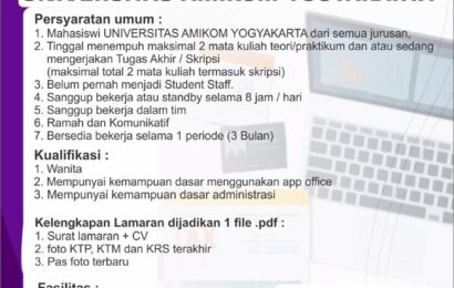 Persyaratan Umum * Mahasiswa Universitas Amikom Yogyakarta Pria/Wanita dari semua jurusan (telah menempuh semua teori dan tinggal mengerjakan TA / Skripsi ) * Sehat Jasmani dan Rohani * Sanggup bekerja atau standby selama 8 jam / hari * Sanggup bekerja dalam tim * Berpenampilan Rapi, Kreatif & Komunikatif * Bersedia bekerja selama min 3 Bulan. […]