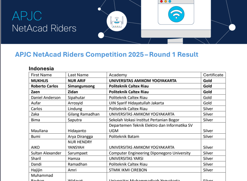 Read MoreYogyakarta, 25 April 2025 — Mahasiswa Universitas AMIKOM Yogyakarta, Mukhlis Nur Arif, berhasil meraih medali emas dalam kompetisi Asia-Pacific, Japan and China (APJC) Cisco NetAcad Riders 2025 Round 1 yang digelar secara daring pada awal tahun 2025. Prestasi ini membawa Mukhlis terpilih sebagai salah satu dari tiga perwakilan Indonesia untuk melaju ke babak selanjutnya. Cisco […]