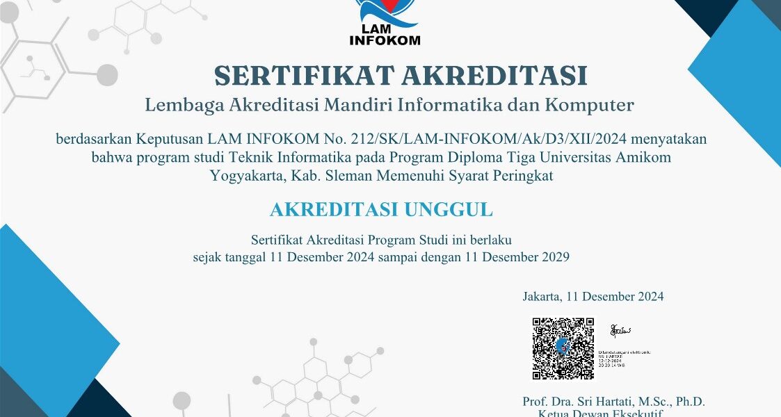 Read MoreYogyakarta, 24 Desember 2024 – Program Studi D3 Teknik Informatika, Fakultas Ilmu Komputer, Universitas AMIKOM Yogyakarta, meraih akreditasi Unggul dari Lembaga Akreditasi Mandiri Informatika dan Komputer (LAM INFOKOM). Akreditasi ini diberikan berdasarkan Keputusan LAM INFOKOM No. 212/SK/LAM-INFOKOM/Ak/D3/XII/2024. Akreditasi Unggul yang diraih Program Studi D3 Teknik Informatika menjadi bukti kualitas pendidikan yang diberikan oleh Prodi tersebut. […]