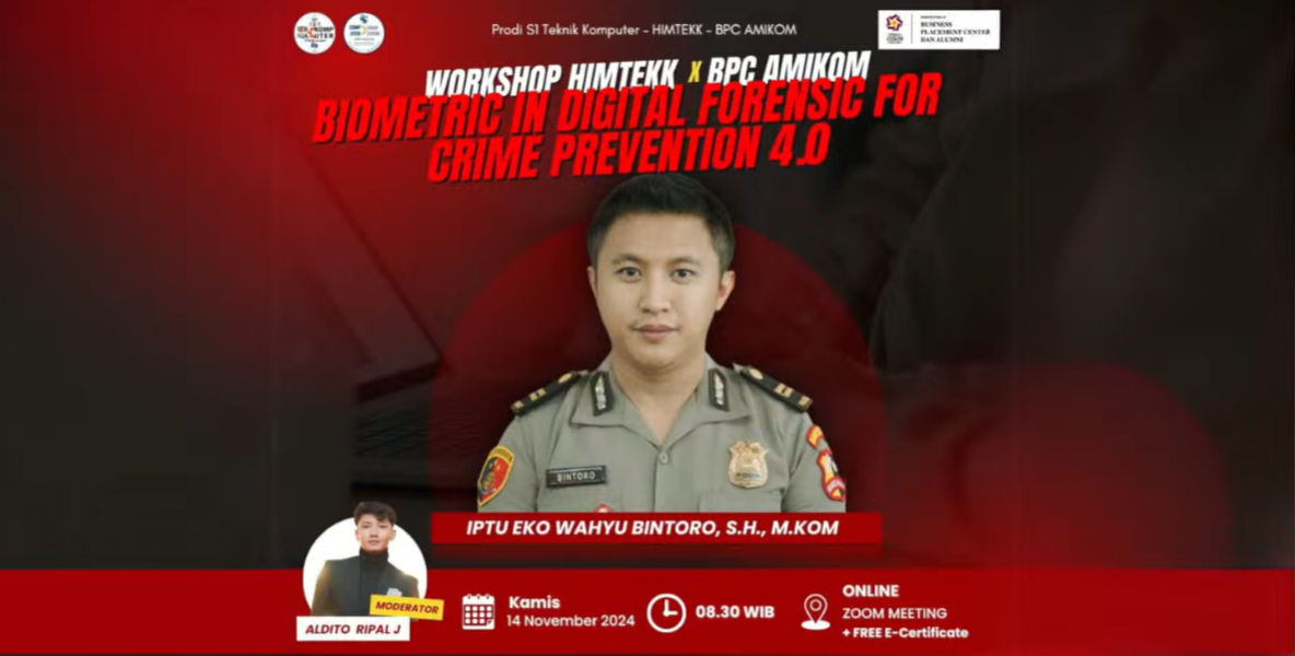 Read MoreYogyakarta – Universitas Amikom Yogyakarta melalui Himpunan Mahasiswa Teknik Komputer (HIMTEKK) bekerja sama dengan Business Placement Center (BPC) menggelar workshop bertema “Biometric in Digital Forensic for Crime Prevention 4.0” Yang diadakan Pada Hari Kamis, 14 November 2024. Workshop Ini berfokus pada penggunaan teknologi biometrik dalam forensik digital untuk mencegah kejahatan, dengan penekanan pada metode pencegahan […]