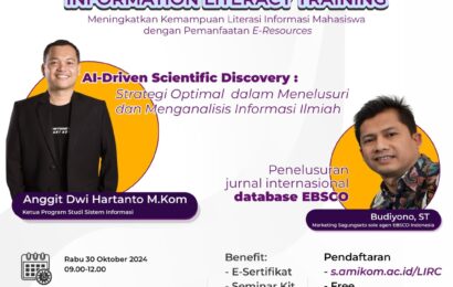Yogyakarta, 29 Oktober 2024 – Dalam rangka meningkatkan kemampuan literasi informasi mahasiswa, Amikom Resource Center mengadakan Information Literacy Training dengan tema “Meningkatkan Kemampuan Literasi Informasi Mahasiswa dengan Pemanfaatan E-Resources”. Acara ini bertujuan memberikan wawasan kepada mahasiswa terkait strategi pemanfaatan sumber daya digital untuk mendukung kebutuhan akademik dan penelitian. Kegiatan yang dihadiri puluhan mahasiswa ini dibuka […]