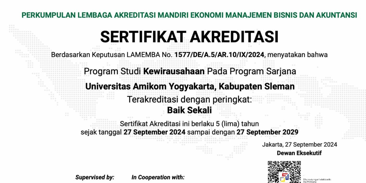 Read MoreYogyakarta, 21 Mei 2024 – Program Studi S-1 Kewirausahaan Universitas AMIKOM Yogyakarta berhasil meraih akreditasi “𝗕𝗔𝗜𝗞 𝗦𝗘𝗞𝗔𝗟𝗜” dari Lembaga Akreditasi Mandiri Ekonomi Manajemen Bisnis dan Akuntansi (LAMEMBA) untuk periode tahun 2024-2029. Keputusan ini tertuang dalam Surat Keputusan No. 1577/DE/A.5/AR.10/lX/2024. Sertifikat Akreditasi ini berlaku 5 tahun sejak tanggal 27 September 2024 sampai dengan 27 September 2029 […]