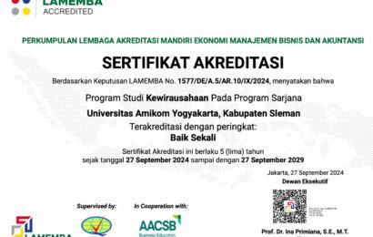 Yogyakarta, 21 Mei 2024 – Program Studi S-1 Kewirausahaan Universitas AMIKOM Yogyakarta berhasil meraih akreditasi “𝗕𝗔𝗜𝗞 𝗦𝗘𝗞𝗔𝗟𝗜” dari Lembaga Akreditasi Mandiri Ekonomi Manajemen Bisnis dan Akuntansi (LAMEMBA) untuk periode tahun 2024-2029. Keputusan ini tertuang dalam Surat Keputusan No. 1577/DE/A.5/AR.10/lX/2024. Sertifikat Akreditasi ini berlaku 5 tahun sejak tanggal 27 September 2024 sampai dengan 27 September 2029 […]
