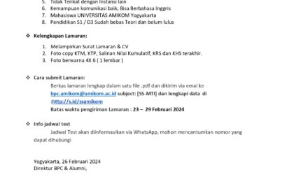 Dalam rangka memaksimalkan pelayanan akademik agar lebih baik dan memberi pengalaman kepada mahasiswa dalam menghadapi dunia kerja, maka Bagian DPK UNIVERSITAS AMIKOM YOGYAKARTA membuka kesempatan bagi mahasiswa AMIKOM untuk menjadi student staff dengan kualifikasi sebagai berikut : Persyaratan Umum: Mahasiswa Universitas AMIKOM (Pria/ Wanita) dari semua prodi sebanyak 2 orang yang telah menempuh semua teori […]