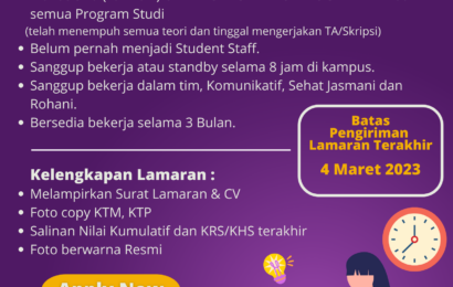 Dalam rangka memaksimalkan pelayanan akademik agar lebih baik dan memberi pengalaman kepada mahasiswa dalam menghadapi dunia kerja, maka Bagian DPK UNIVERSITAS AMIKOM YOGYAKARTA membuka kesempatan bagi mahasiswa AMIKOM untuk menjadi student staff dengan kualifikasi sebagai berikut : 1. Persyaratan Umum: • Mahasiswa Universitas AMIKOM (Pria/ Wanita) dari semua prodi sebanyak 2 orang yang telah menempuh […]