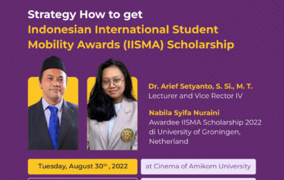 Hadiri Seminar dengan tema Strategy How to Get Indonesian International Student Mobility Awards (IISMA) Scholarchip dengan dua narasumber yang sangat keren dan berprestasi, yaitu: 1. Dr. Arief Setyanto, S.Si., M., M.T selaku Dosen dan Wakil Rektor IV 2. Nabila Syifa Nuraini selaku Penerima Beasiswa IISMA 2022 di Universitas of Groningen, Belanda Semianr akan dilaksanakan pada: […]