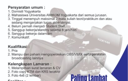 Dalam rangka memberikan pengalaman kepada mahasiswa dalam menghadapi dunia kerja, maka Bagian DAAK UNIVERSITAS AMIKOM YOGYAKARTA membuka kesempatan bagi mahasiswa AMIKOM untuk menjadi student staff dengan kualifikasi sebagai berikut: Persyaratan Umum: Mahasiswa (Pria dan Wanita) UNIVERSITAS AMIKOM YOGYAKARTA dari semua Program Studi (telah menempuh semua teori dan tinggal mengerjakan TA / Skripsi). Belum pernah menjadi […]